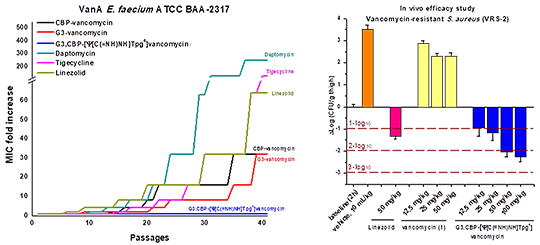 A class of true supernatural products that supersede the natural product, the maxamycins possess pocket modifications that overcome vancomycin resistance, reinstating transpeptidase inhibition and cell wall synthesis inhibition by binding to the altered target substrate D-Ala-D-Lac, while maintaining binding to the original target D-Ala- D-Ala of vancomycin. In addition, the peripheral modifications introduce two new synergistic mechanisms of action not seen with vancomycin itself. One peripheral modification (CBP modification) results in the direct competitive inhibition of transglycosylase affecting a separate step in cell wall biosynthesis and the second (G3 modification) induces cell permeability reducing cell wall integrity likely through cell wall teichoic acid binding and induced autolysin release, both of which are independent of one another and of D-Ala-D-Ala/D-Lac binding [15]. The synergic enhancement in activity derived from each modification, each of which increases both potency and durability against raising resistance, requires incorporation into a single molecule, indicating that it arises from the simultaneous expression of all three mechanisms of action at the same time and at the same place in the cell wall (Figure 3).