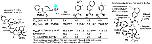 These studies were based on well-founded rationales, used systematic well-designed analogues (>400 analogues) to answer fundamental questions on the molecular interaction of vinblastine with its biological target (tubulin) or targeting its source of resistance (Pgp), enlisted traditional medicinal chemistry correlations to optimize activities, were accessed by new methodology developed for this purpose, and relied on a series of key functional and on-target assays to produce supernatural products far exceeding the potency and properties on the natural product. Approaches to improve the biological properties of natural products often strive to identify the essential pharmacophore to simplify the structure or make functional group changes to improve biological target affinity or functional activity, change physical properties, enhance stability, or introduce conformational constraints. Aside from accessible semi-synthetic modifications of existing functional groups, rarely does one consider using chemical synthesis to add molecular complexity to the natural product. In part, this may be attributed to the added challenge intrinsic in the synthesis of an even more complex compound. We discovered synthetically-derived, structureally more complex vinblastines inaccessible from the natural product itself that are a stunning 100-fold more active (IC50’s 50–75 pM vs 7 nM, HCT116) [25], and that are now accessible because of advances in the total synthesis of the natural product (Figure 6).