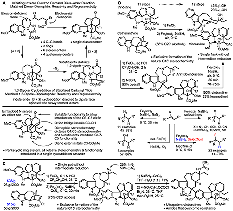 Over 400 analogues of vinblastine were prepared, and it is a tribute to the advances in organic synthesis that such work can now be conducted on a natural product of a complexity once thought refractory to such an approach. Although it could not have been imagined at the stage that we initiated our efforts, the C20’ vinblastine analogues are now available in three steps from inexpensive commercially available materials (catharanthine, $16/g; vindoline, $36/g; Figure 7) [25].