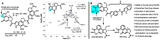 Our recent work led to the discovery of a new class of reductively activated prodrugs specifically designed for this class of natural products, mapping seamlessly onto their core structures [53]. This new class of prodrugs proved especially efficacious in vivo, yet are remarkably non-toxic, displaying no myelotoxicity and effectively taming the potent cytotoxic activity of the natural products (Figure 9). Notably, the prototype members of the prodrug class bear structural simplifications that emerged in our studies that improve stability, enhance in vitro potency and in vivo efficacy, and simplify synthetic access. Ongoing preclinical studies of one of our lead compounds defined the site (intracellular, cancer vs normal cell lines), slow sustained rate, and mechanism of the exclusively protein-mediated prodrug cleavage and free drug release mediated by protein cysteine residue[54]. Optimization of these compounds fortolerability, safety, and therapeutic efficacymay provide a breakthrough in the clinicaltreatment of cancer, defining a new targeted precision therapy.
