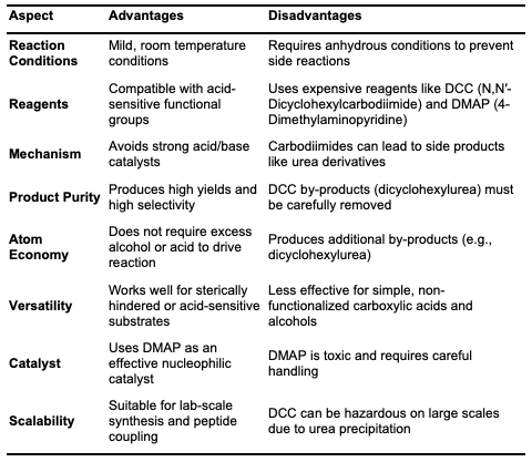 It is considered one of the most efficient methods for ester synthesis [15]. This reac- tion typically employs carbodiimide coupling reagents, such as N,N'-dicyclohexyl- carbodiimide (DCC), N,N'-diisopropyl-carbodiimide (DIC), and N-ethyl-N'-(3- dimethylaminopropyl)carbodiimide (EDC). For example, DCC reacts with a carboxylic acid in the presence of dimethylamino-pyridine (DMAP) to facilitate ester formation.