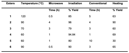 Table 5, below, provides a comparative analysis of reaction times and yields for synthesizing various esters using microwave irradiation versus conventional heating methods, highlighting the efficiency and benefits of microwave-assisted synthesis in terms of both reaction speed and product yield.