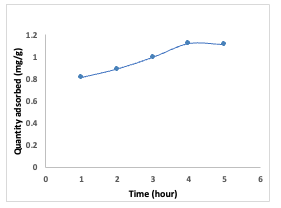 The quantity of adsorbent used in the experiment was adjusted, ranging from 0.01to 0.05 g. It was observed that as the amount of adsorbent increased, the quantity adsorbed decreased. This can be attributed to anagglomeration of the adsorbent particles due to the increased quantity of adsorbents employed [10,14,18].