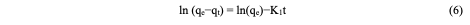 The Lagergren model (equation 6)parameters for the uptake of Congo red dye by the [Cu(BTCA)(AMB)] absorbent was derived by plotting ln (qe−qt) against time from the linearized form of the equation given below.