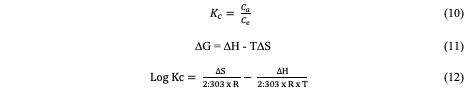 In the equations above, Kc is the equilibrium constant, Ca and Ce represent the quantity of Congo red dye adsorbed on the adsorbent and the final concentration of the solution, respectively. T is the temperature in kelvin and R= molar gas constant which is 8.314 JK-1mol-1.