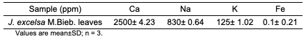 Minerals have an important place in human nutrition. The importance of these minerals, also known as trace elements, has been well understood in recent years, since when missed, causes diseases and major disorders in the human body [30]. The mineral composition of J. excelsa M.Bieb.dried leaves was analyzed and the results revealed that iron was 0.1, calcium 2500, potassium 830, and sodium 125 ppm. These minerals play significant roles in several biological processes. Bone growth and turnover are influenced and regulated by the metabolism of Ca and other minerals, in addition to its role in muscle contraction and blood clotting. Iron is an essential trace element for normal functioning of the central nervous system. It is known to be a component of some metalloenzymes, myoglobin and hemoglobin, which is needed in the transport of oxygen and carbon dioxide during respiration or cellular metabolism. This hemoglobin (containing iron) also serves as a buffer to regulate changes in blood. Potassium and sodium, which are presented in the intracellular and extracellular fluid, help to maintain electrolyte balance and membrane fluidity pH [29]. Also, potassium is involved in inducement of calmness [25]. The amount of Ca was close to its content in Momordica charantia leaves while the amount of Na, K, and Fe was lower [29]. The balanced nutritional composition of J. excelsa M.Bieb.makes it a potential source of nutrients that can be included in a number of foods.