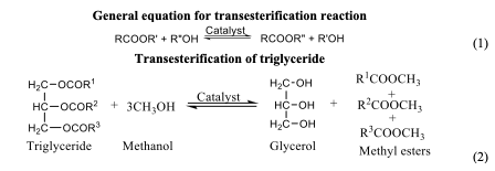 Transesterification is a reaction method that involves the conversion of oils and fatty acids into alkyl esters. The process involves a reaction of triglycerides with an alcohol (alkane) to form alkyl ester of fatty acids and glycerol. It is a versatile reaction that is widely used in the production of biodiesel, polymers, and fine chemicals [64]. Transesterification, also known as alcoholysis, entails the reaction of lipids and low carbon alcohol in the presence of a homogeneous or heterogeneous catalyst [65]. It is also used in the production of hardened vegetable oil as it reduced its viscosity and improved its fuel properties. Methanol and ethanol are usually employed in the transesterification process, but methanol is preferred because of it is economically friendly nature and steady availability. As many underutilized seed oils are emerging, the transesterification to fatty acid methyl or ethyl esters prior to analysis have been widely adopted [66,67]. The application of the transesterification techniques extended to analysis of triacylglycerol (fats and oils) from animal sources [68]. Transesterification process can be carried out through homogenous or heterogeneous acid or base catalysts. Generally, it is believed that homogeneous catalysis undergoes a fast reaction when compared to the heterogenous catalyst; yet, it cannot be reused, which serves as a major setback. However, the use of heterogenous catalysis in continuous biodiesel production results in high activity, high selectivity, ease of separation from product and catalyst reusability, although its reaction often takes longer [69]. Despite the time taken for the reaction to complete, heterogeneous plays a major role in overcoming the challenges faced by homogeneous catalysis. This includes the ability to regenerate and recycle the products, quick separation and purification of product. There are some factors affecting the transesterification process which include the type of catalyst used and concentration, mole ration, reaction time, temperature, and free fatty acid [70].