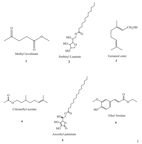 Typically, esters are synthesized through the esterification reaction, wherein carboxylic acids and alcohols react in the presence of a catalyst. Other methods, such as reactions with carboxylic anhydrides or halides, are also employed for ester production [2]. This synthesis is increasingly significant due to esters' unique applications in various fields, including biodegradable polymers, thermoplastics, pharmaceuticals, agrochemicals, cosmetics, and food additives. For instance, esters like polylactic acid and polyethylene terephthalate are pivotal in producing bio- degradable plastics, while others add flavors to foods or fragrances to personal care products [3]. Additionally, ester derivatives, such as benzyl benzoate, methyl benzoate, and benzyl acetate, demonstrate therapeutic and antimicrobial properties, further highlighting their importance in pharmaceuticals [4].