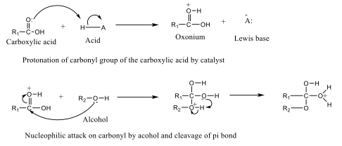 Esterification of alcohols with carboxylic acids in the presence of an acid catalyst is known as acid-catalyzed esterification. This process (Figure 5) involves the protonation of the carboxylic acid, which increases the electrophilicity of the carbonyl carbon, making it more susceptible to nucleophilic attack by alcohol.