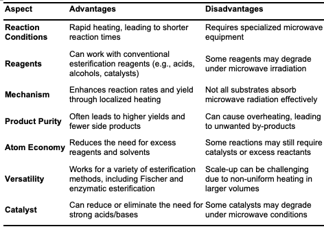 Table 5, below, provides a comparative analysis of reaction times and yields for synthesizing various esters using microwave irradiation versus conventional heating methods, highlighting the efficiency and benefits of microwave-assisted synthesis in terms of both reaction speed and product yield.