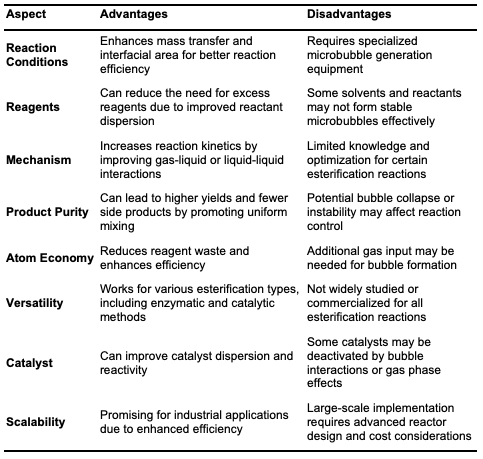 Microbubble technology is an innovative method for enhancing esterification efficiency, particularly in biodiesel production from vegetable oils, as well as in synthesizing esters for pharmaceuticals and fragrances. Microbubbles, generated using a micro-bubble generator, have diameters between 10 and 100 micrometers [39]. This technique can be implemented through methods such as ultrasonics, gas sparging through porous materials, and mechanical agitation. Studies have shown that microbubbles significantly improve mass transfer at the gas-liquid interface, providing a stable surface area where reactants can easily diffuse to the reactive sites [6]. The small size and high surface area of microbubbles allow for uniform distribution and effective mixing within the liquid medium, optimizing reaction conditions. For example, reactions between carboxylic acids and alcohols, such as oleic acid with methanol or ethyl acetate production, demonstrate higher yields in shorter reaction times when using microbubble reactors [40].