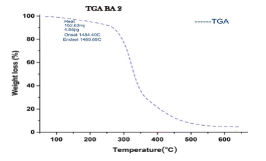 The TGA of the compound showed two stages of decomposition within a temperature range of 0–650°C [9-11]. The first stage of decomposition results to about 12% weight loss, ranging from a temperature of 0–290°C.The second decomposition stage, which starts from 290°C and ends at 500°C, results in a weight loss of 79%. Figure 4 shows the TGA curve of the sample.