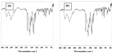 Using a Shimadzu FTIR spectrophotometer,the functional groups present in the[Cu(BTCA)(AMD)] compound, before and after adsorption, were obtained by studying the spectral as shown in Figure 5. Peaks observed at 3496.99 cm-1 and 3444.96 cm-1were attributed to the presence of hydroxyl(O-H) and amino group (N-H), respectively.The peak observed at 1710 cm-1 was attributed to the carbonyl group of the carboxylate. The diagnostic region of the compound, before and after adsorption, were observed to be similar. However, the presence of the Congo red dye on the compound, after adsorption, causes a significant difference in the fingerprint region (Figure 5, a and b).