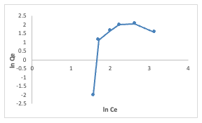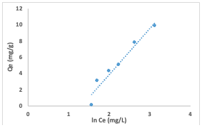 where Ka (L/mg) is the Langmuir constant, and Co (mg/L) is the initial concentration.The adsorption process can be determined as favorable when the RL value lies between 0 and 1. The Qm value was found to be -0.6922 and the constant Ka to be -0.09. The RL was calculated to be -0.8, which falls below 0 and indicates unfavorable adsorption, while theR2 value was obtained as 0.1166.The relationship of the amount adsorbed per unit mass or mole with concentration is demonstrated by the Freundlich model (equation 4) given as: