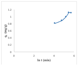 The adsorption of Congo red onto the adsorbent surfaces was analyzed using the Elovich model. This model accounts for the non-linear behavior that is frequently seen during the early phases of adsorption. The Elovich equation, plot of qt against ln(t), presented a slope of (1/ β) and an intercept of(1/β) ln (αβ). The value of β was calculated to be 4.87, and α to be 0.16 (Figure 17).