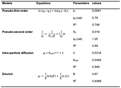 However, it's worth noting that the correlation coefficients (R2) were found to be high with a value of 0.9389, indicating that this model is suitable for an assessment of the adsorption process [17]. The linearized equation (9) for the Elovich kinetic model is given as: