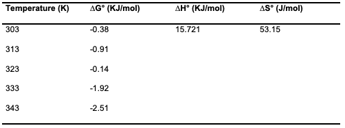 To obtain the thermodynamics data of the adsorption study of Congo red dye on the adsorbent, an investigation of thethermodynamics was done at five different temperatures ranging from 30° to 70°C. The change in Gibbs free energy (∆G°), change in entropy (∆S°) and change in enthalpy (∆H°) were calculated based on the equations 10, 11& 12 [11]: