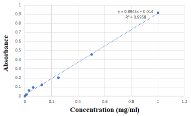 Phenolics are secondary metabolites that are omnipresent in plants. They are a large group of bioactive compounds comprising about 8000 compounds [18]. The two major classes of phenolic compounds include flav- onoids and phenolic acids [19]. The total phenolics of Juniperus excelsa M.Bieb. extracts were determined by the Folin–Ciocalteu method with some modifications commensurate with laboratory work. 0.0025 mL of each extract was mixed with 0.5 mL of Folin–Ciocalteu reagent in complete darkness for 10 min, and then 1 mL of sodium carbonate solution 15% was added. The extracts were kept in the dark for 30 min and the absorbance was measured at 740 nm. A calibration curve with gallic acid (1 mg/mL) was established, where (0.01, 0.03, 0.06, 0.125, 0.25, 0.5, 1) mg/mL of gallic acid solution were used instead of the studied sample, and the total phenolic content was expressed in milligrams of gallic acid per mL of Plant extract. Figure 2 shows the standard curve of gallic acid [20,21].