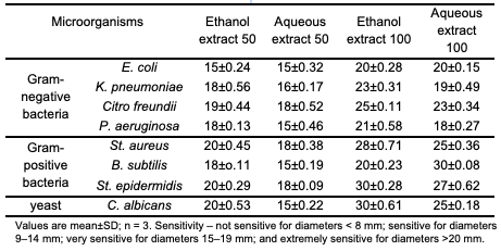 The results are as shown in Table 5 showed that the ethanol and aqueous extracts have an inhibition effect on the growth of all microorganisms tested with varying degrees of inhibition, depending on the bacterial strains and volume of extract applied.